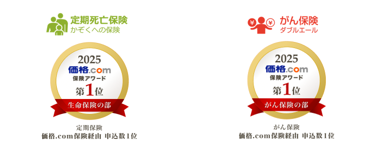 株式会社カカクコム・インシュアランス主催の『価格.com 保険アワード 2025 年版』※1において、定期死亡保険「かぞくへの保険」が生命保険の部(定期保険)で 9年連続で第1位、また、がん保険「ダブルエール」はがん保険の部で初めて第1位※2を受賞しました。